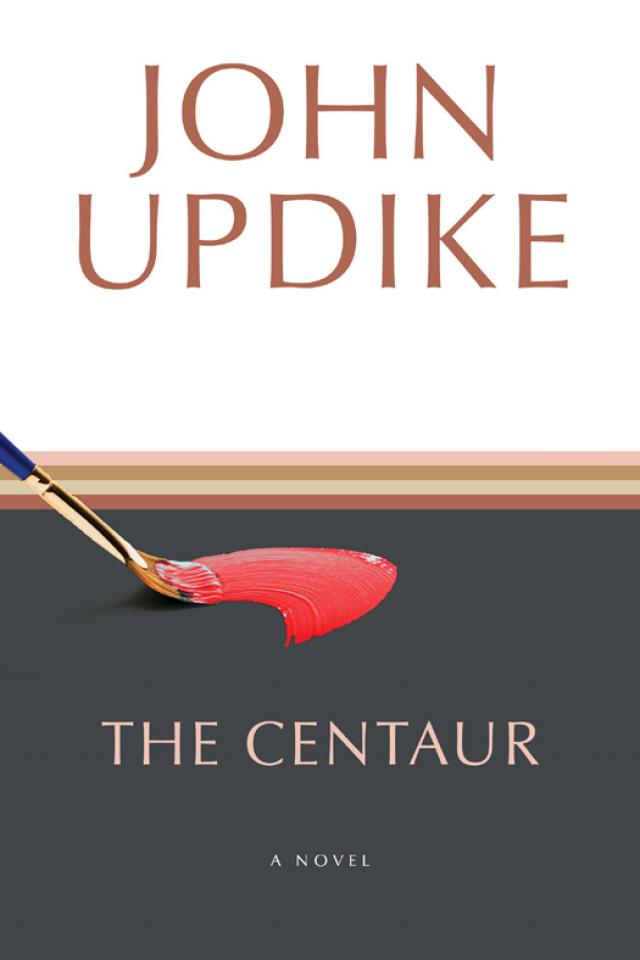 Out in the hall, the feather end of the arrow scraped on the floor with every step. The metallic scratch and stiff rustle mixed disagreeably. His stomach began to sway with nausea. The dim, long walls of the ochre hall wavered; the classroom doors, inset with square numbered panes of frosted glass, seemed experimental panels immersed in an activated liquid charged with children’s voices chanting French, singing anthems, discussing problems of Social Science. Avez-vous une maison jolie? Oui, j’ai une maison très jolie for amber waves of grain, for purple mountain majesties above the fruited plain throughout our history boys and girls (this was the voice of Pholos), the federal government has grown in prestige, power, and authority but we must not forget, boys and girls, that by origin we are a union of sovereign republics, the United God shed his grace on thee, and crown thy good with brotherhood—the beautiful song was blindly persisting in Caldwell’s brain. To shining sea. The old baloney. He had heard it first in Passaic. Since then, how strange he had grown! His top half felt all afloat in a starry firmament of ideals and young voices singing; the rest of his self was heavily sunk in a swamp where it must, eventually, drown. Each time the feathers brushed the floor, the shaft worked in his wound. He tried to keep that leg from touching the floor, but the jagged clatter of the three remaining hooves sounded so loud he was afraid one of the doors would snap open and another teacher emerge to bar his way. In this crisis his fellow-teachers seemed herdsmen of terror, threatening to squeeze him back into the room with the students. His bowels weakly convulsed; on the glimmering varnished boards, right in front of the trophy case with its hundred silver eyes, he deposited, without breaking stride, a steaming dark spreading cone. His great gray-dappled flanks twitched with distaste, but like a figurehead on the prow of a foundering ship his head and torso pressed forward.